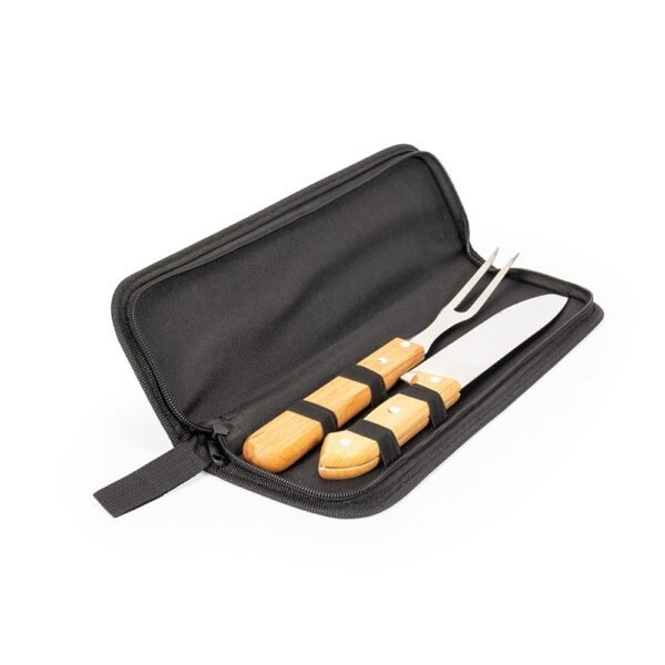 Kit churrasco 2 peças com estojo, contém faca e garfo. Estojo com alça para transporte e área interna com elástico de fixação para os utensílios.