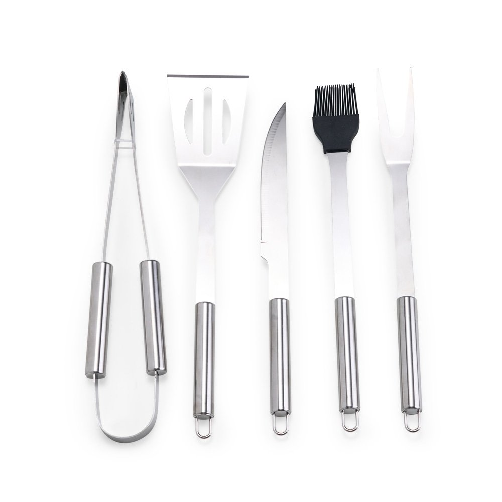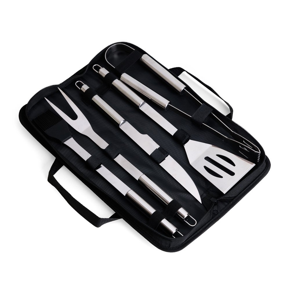 Kit churrasco com cinco peças em inox. O conjunto inclui: uma faca de 6 polegadas, um garfo, uma espátula, um pincel com cerdas de silicone e um pegador. Acompanha estojo em nylon com um par de alças para transporte e placa metálica personalizável com verso autoadesivo para fixação.